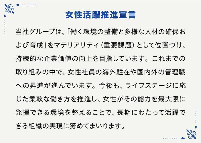 そこで、多様性の中でも女性活躍の推進をとりわけ重要なテーマと位置付け、グループ一体で「女性活躍推進宣言」を掲げました。